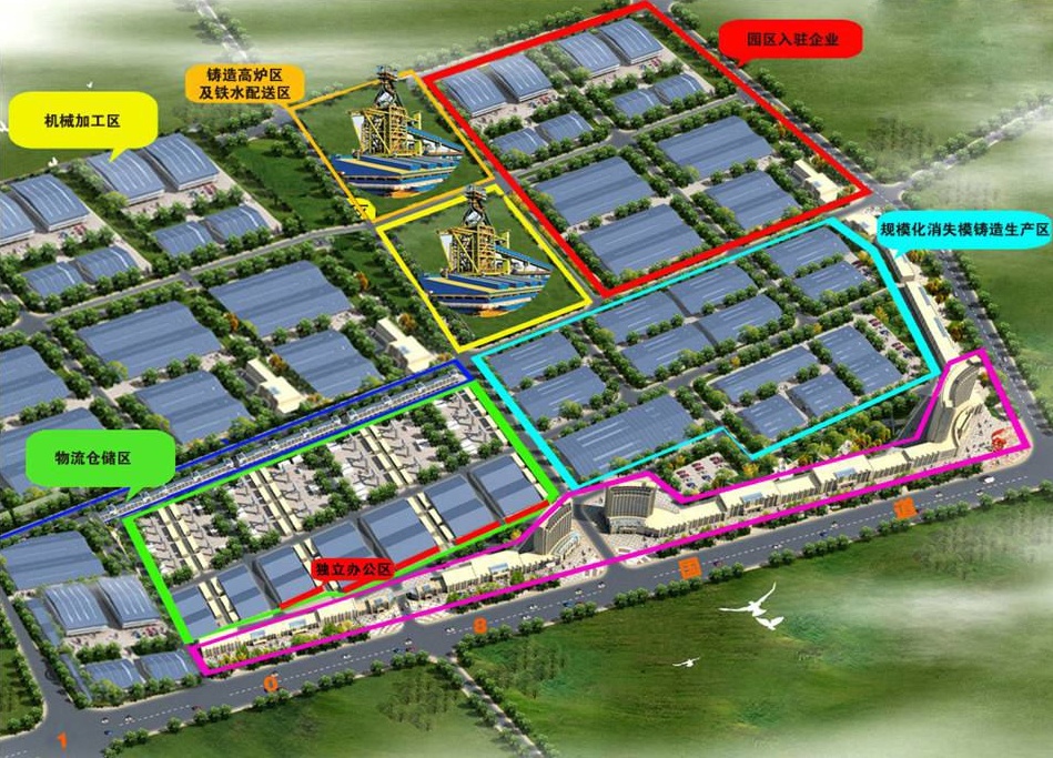 By 2017, the production capacity of Feng Yan casting agglomeration will reach 600,000 tons. Meanwhile, a cohort of related equipment manufacturing enterprises and auxiliary services will settle in the industrial park and maximize resource integration and sharing. A complete industrial chain will be formed: molten-- iron-casting--machinofacture--whole set. Our goal is to become the largest casting and equipment manufacturing base in China within 3 years. We target an annual sales revenue of 10 billion CNY (US$ 1.6 billion).